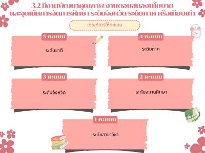 3.2 มีงานพัฒนาคุณภาพ/งานตอบสนองนโยบายและจุดเน้นการจัดการศึกษา ระดับจังหวัด/ระดับภาค หรือเทียบเท่า