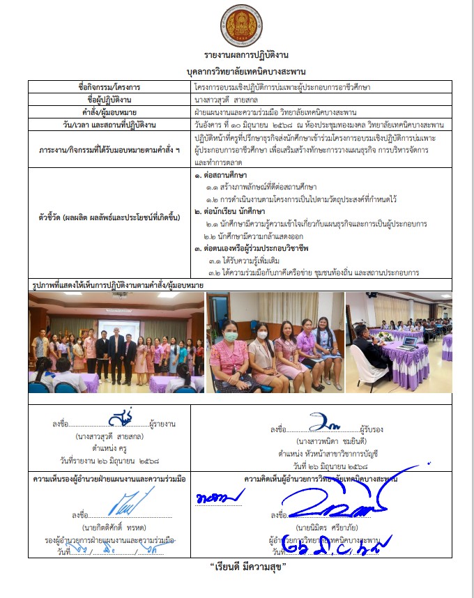 ►►1. เข้ารับการอบรมแผนธุรกิจ ของศูนย์บ่มเพาะฯ และได้ส่งแผนธุรกิจเข้าร่วมประกวดโครงการอาชีวสร้างฝัน แปรฝันสู่ธุรกิจ RRR Award 2568 เข้ารอบ 85 ทีม จากทั้งหมด 244 ทีม