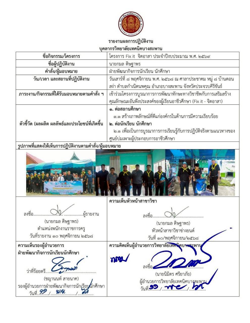 โครงการบูรณาการการพัฒนาทักษะทางวิชาชีพกับการเสริมสร้างคุณลักษณะอันพึงประสงค์ของผู้เรียนอาชีวศึกษา (Fix it - จิตอาสา) ประจำปีงบประมาณ พ.ศ. 2569