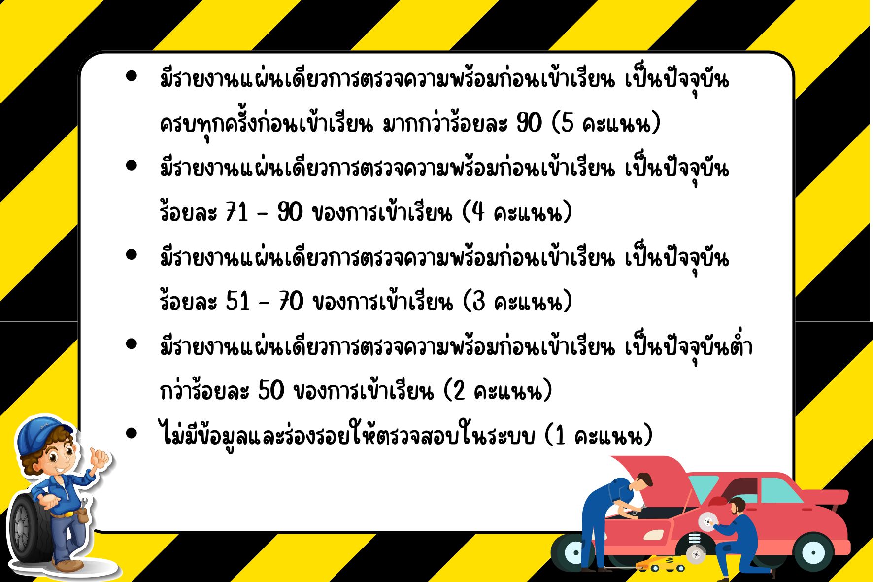 มีรายงานแผ่นเดียวการตรวจความพร้อมก่อนเข้าเรียน เป็นปัจจุบันครบทุกครั้งก่อนเข้าเรียน มากกว่าร้อยละ 90