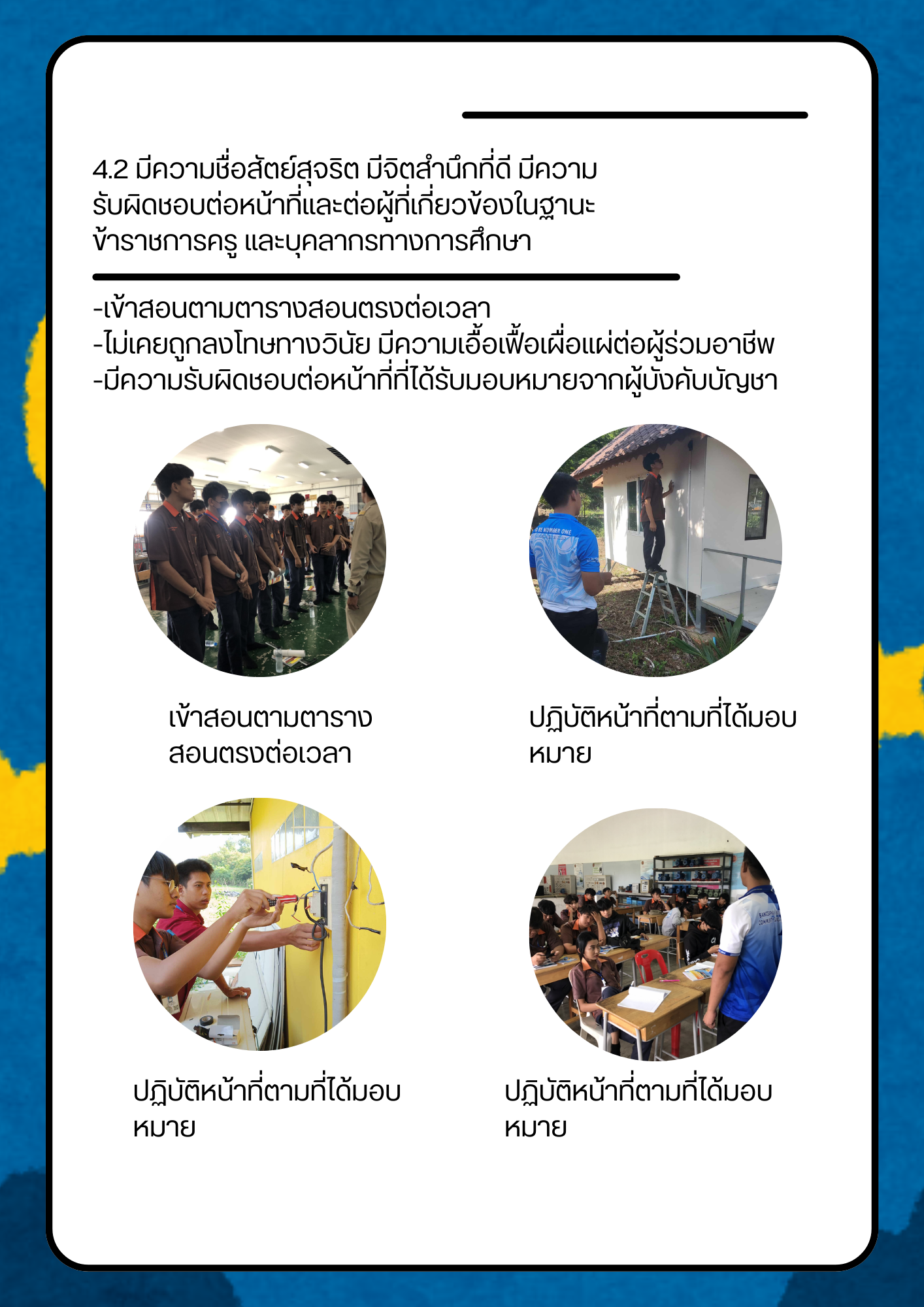 4.2 มีความซื่อสัตย์ สุจริต มีจิตสำนึกที่ดี มีความรับผิดชอบต่อหน้าที่และต่อผู้ที่เกี่ยวข้องในฐานะข้าราชการครูและบุคลากรทางการศึกษา